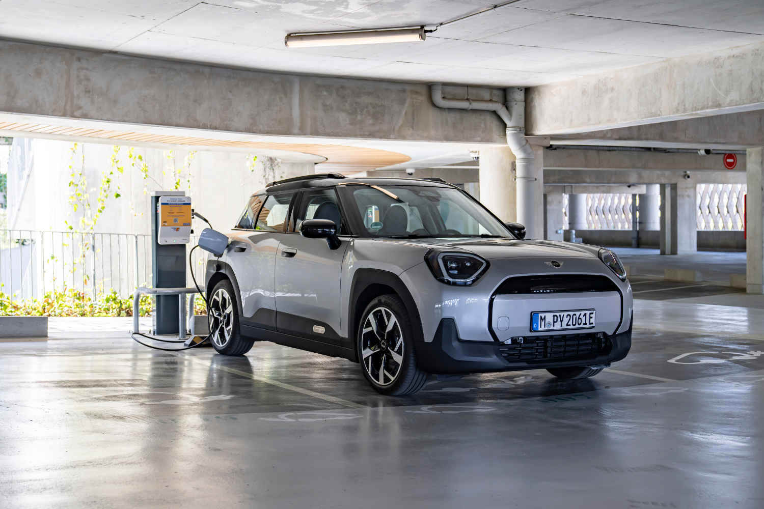 BMW i5 charging at a charging port.